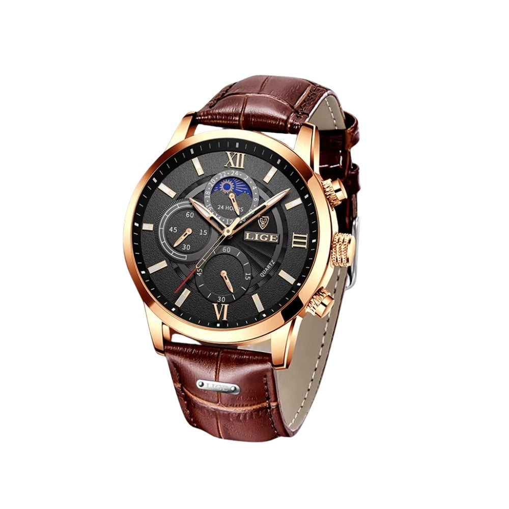 Denna eleganta herrklocka från LIGE kombinerar klassisk design med modern funktionalitet. Med en lyxig roséguldfinish, läderarmband och detaljer som månfas, datumvisning och kronograf, är detta en tidlös accessoar för både vardag och fest. Den vattentäta konstruktionen på 30M gör att du tryggt kan bära klockan i alla väder.